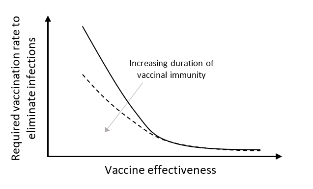 Figure 2: Schematic of qualitative vaccination rate required to eliminate infections as a function of the effectiveness and duration of vaccinal immunity adapted from.63